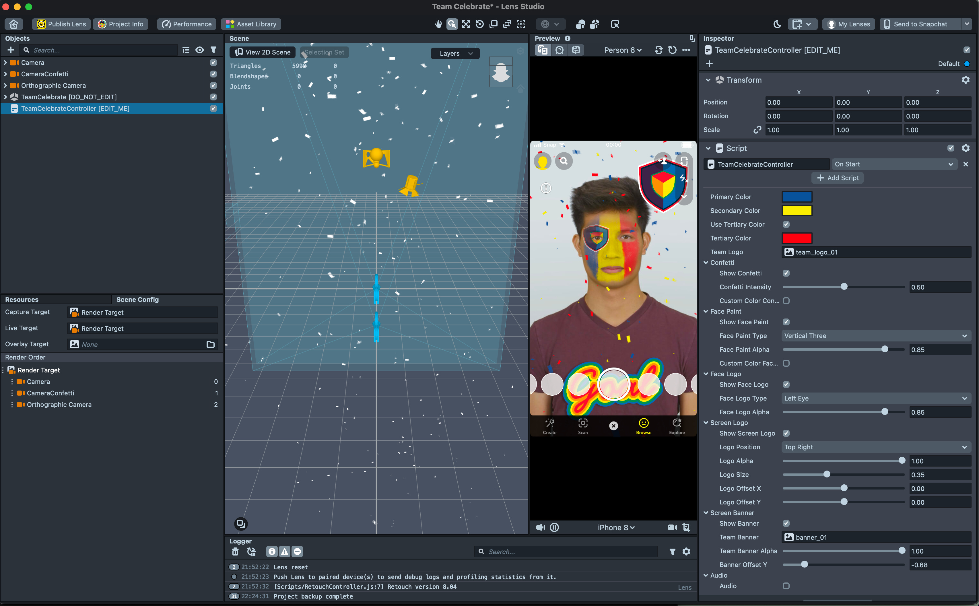 When you open Lens Studio, you’ll see all the available templates. Just click on “Team Celebration” to select it, and it will load up the project for you.